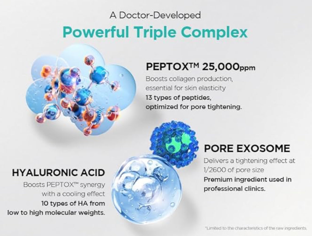 - Triple Complex Formula: Combines PEPTOX peptides, hyaluronic acid, and exosome; supports skin firmness, hydration, and improved texture for a more balanced appearance